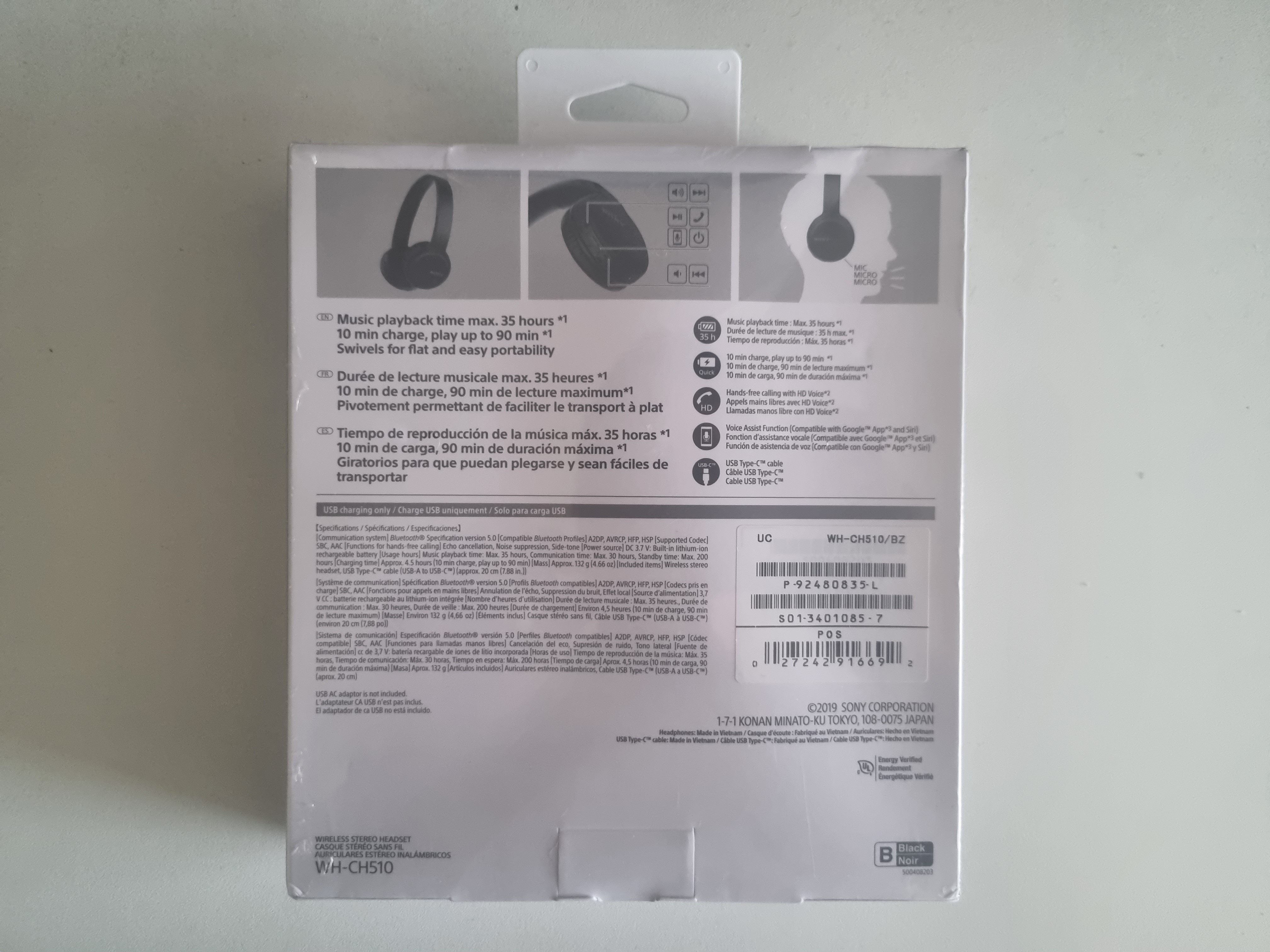 The box is pretty much standard cardboard, displaying some of the product's specifications, like Bluetooth 5.0, the 35 hour battery duration, flat folding and mic/controls. And it also comes with a USB cable Type-C for recharging (no fast charge though).