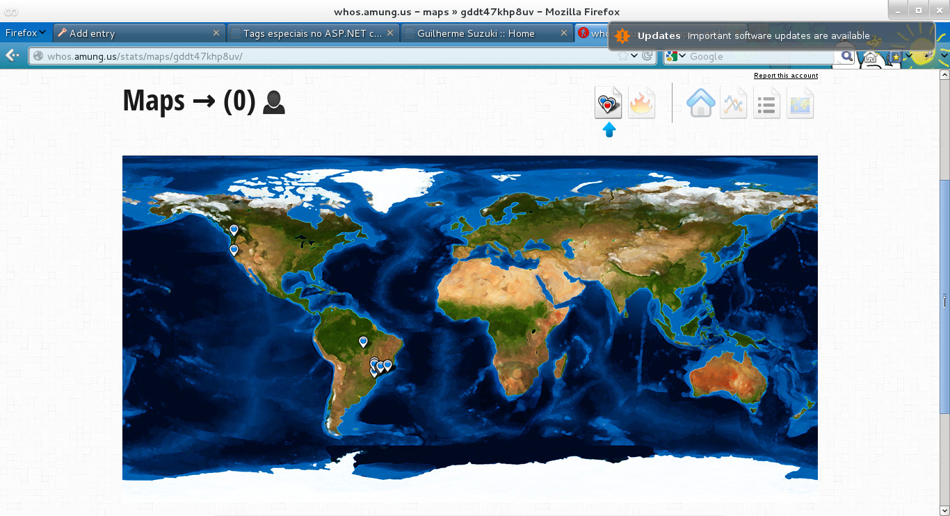 Não bastasse nos poupar do trabalho entediante de contabilizar os acessos, criar páginas para monitorá-los, etc. whos.amung.us disponibiliza a distribuição dos acessos num mapa, conforme a figura abaixo: